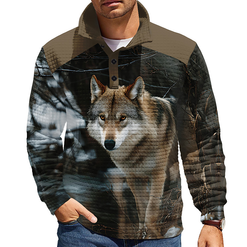 Men's Wolf Waffle Sweatshirt Daily Classic Hunting Stand Collar Outdoor Work Gift Blue Black Khaki Buttons Fall Winter Designer S M L XL XXL XXXL