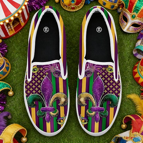 scarpe da donna in tela slip-on con stampa di perline e gigli di Mardi Gras: calzature comode ed eleganti per le sfilate di carnevale, feste all'aperto, feste a tema e gite estive quotidiane