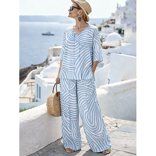 Per donna Set di Pantaloni Bolero Top Manica 3/4 Scollo a V Grafico Geometrico Stampato Vacanza Moda Casuale Quotidiano Vacanza Blu Marrone Estate Vestibilità comoda