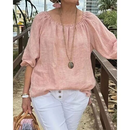 Per donna Camicie di cotone e lino Semplice Essenziale Moderno Manica 3/4 Colletto a Camicia Top Regolari Quotidiano Tasca Bottoni Bianco Giallo Rosa Azzurro cielo Estate Primavera Autunno