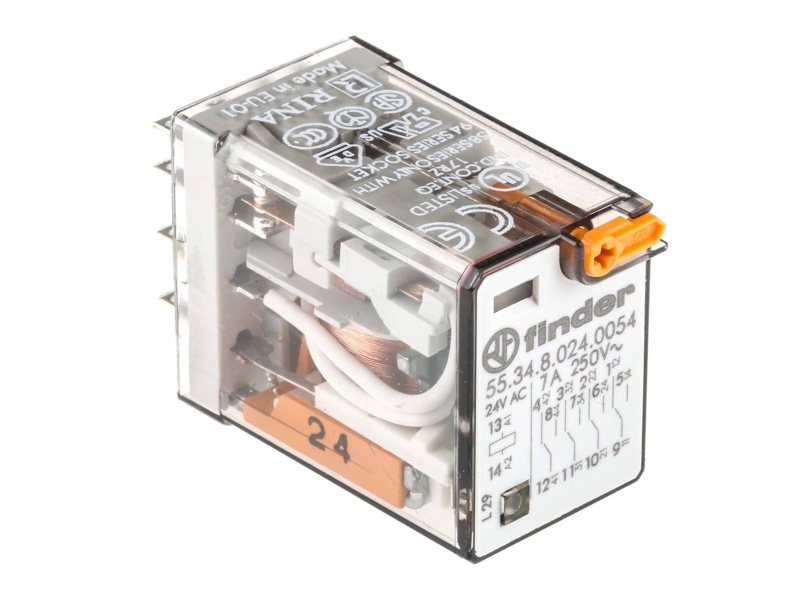 FINDER Industrierelais 7A (15A), 4CO, 24VAC für Steckdose Serie 94. Abschließbare Prüftaste, LED (AC) und mechanische Anzeige.