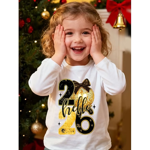 Mädchen-T-Shirt mit 3D-Grafik und Buchstabenaufdruck für die Silvesterparty 2026, langärmlig, für Frühling/Herbst, sportlich, Streetwear, Kindergröße 4-12 Jahre, Rundhalsausschnitt, normale Passform,