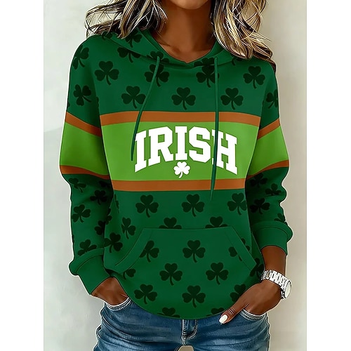 Felpa con cappuccio da donna di San Patrizio Grafica Quadrifoglio Vintage Casual Boho Maniche Lunghe Con Cappuccio Top Regolari Usura Quotidiana Stampa Tasca Frontale Nera Bianca Verde Beige