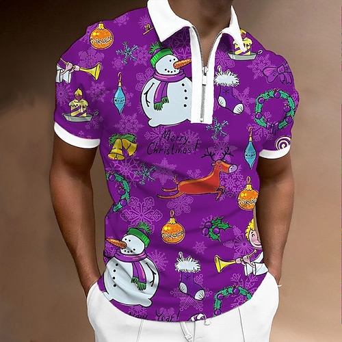 Weihnachten Herren Weihnachtsszene 3D Reißverschluss Polo Golf Schneemann Kragen gelb rosa rot blau hellviolett Outdoor Straße Kurzarm Reißverschluss Druck Kleidung Bekleidung Mode Streetwear