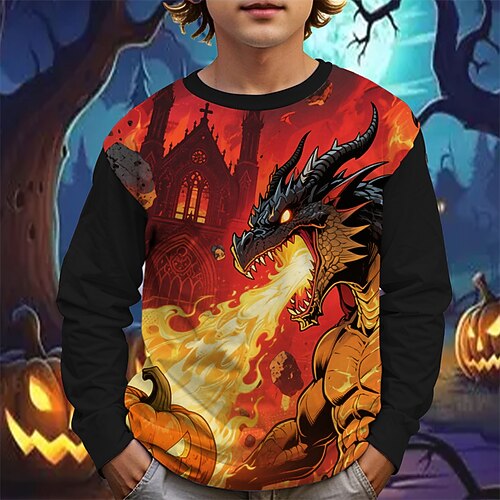 Halloween Jungen 3D Cartoon Dinosaurier T-Shirt Langarm Frühling Herbst Mode Basic Kinder 4-12 Jahre Rundhalsausschnitt Outdoor Lässig Täglich Normale Passform