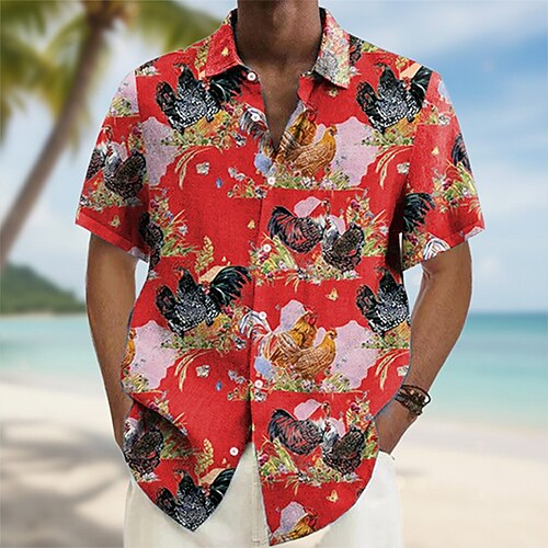 Herren Tiermotiv Hahn Lustig Sommer Hawaiihemd Knopfhemd Alohahemd Kurzarm Hawaiianisch Urlaub Strandbekleidung Sommer Frühling Umlegekragen 3D-Druck Hemden mit Kragen Weiß Rote