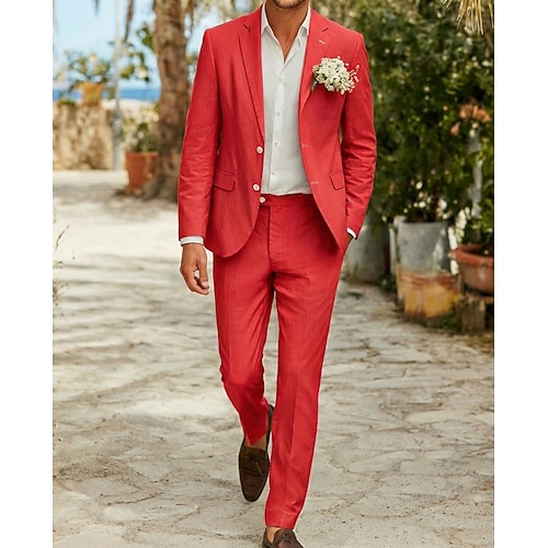 Herren Lässig Strandhochzeit Leinenanzüge Gekerbtes Revers Gelb Rote Mode Täglich Sommer Frühling Einfarbig Figurbetonter Schnitt 2-teilig Einreihige Zwei-Knopf-Jacke