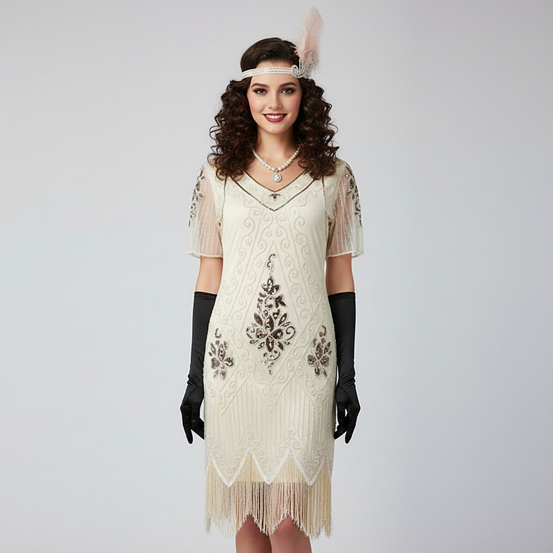 Retro Vintage Roaring 20s 1920s Flapper Dress Dress Outfits The Great Gatsby Sequins Tassel Fringe Fancy Dress Women's Party / Evening Masquerade Adults' Dress Gloves Stockings Spring Summer All