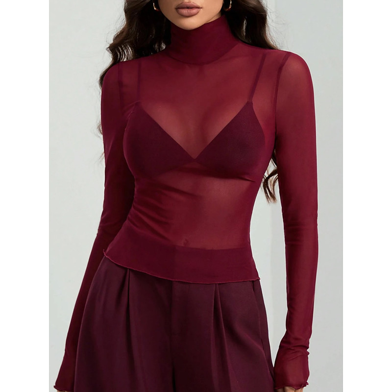 Women's Blouse Solid Color Elegant Stylish Basic Long Sleeve Turtleneck Regular Tops Daily Patchwork Mesh Sage Green Black Wine Navy Blue Brown Summer Spring Fall