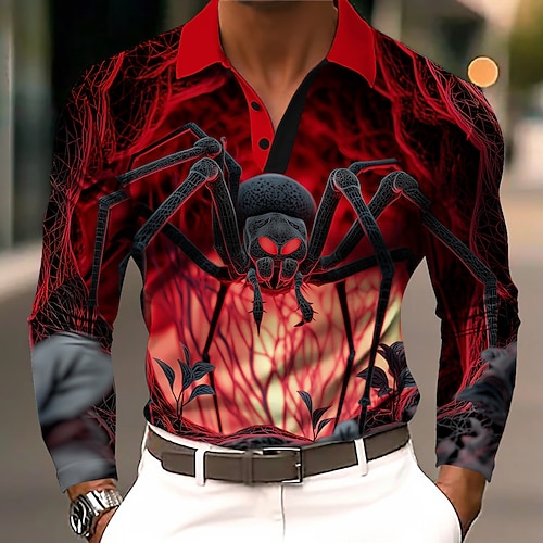 Herren Spinne Polo Langarm Polo-Shirts Revers Lässig Dunkel Straße Athleisure Alltagskleidung 3D-Druck Knöpfe Frühling Herbst Winter Rote