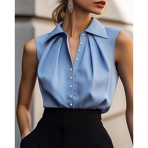 Per donna Camicia Elegant Top in raso Top estivi Arricciato Patchwork Bottoni Tinta unica Semplice Elegante Vintage Signore Senza Maniche Scollo a V Top Regolari Quotidiano Lavoro Ferie Blu Estate