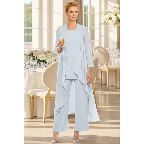 Tuta Completo Pantalone Tre Pezzi Lunghezza al pavimento Abito da cerimonia per signora Senza Maniche Scollo a Barca Elegante Taglie Forti Con Stola Ospite di nozze Chiffon Abiti con Giacca con Tinta