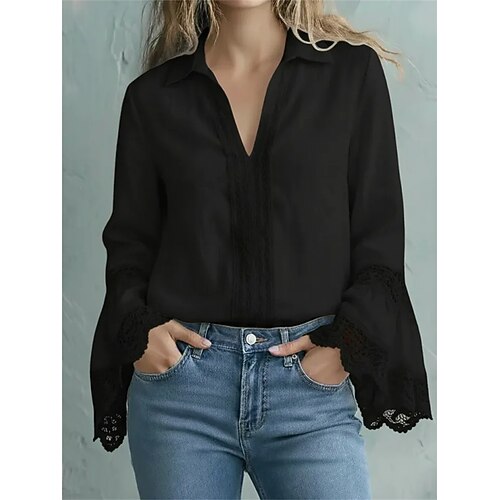 Per donna Blusa Top Eleganti Top in pizzo Arricciato Pizzo Patchwork Tinta unica Semplice Elegante Signore Essenziale Manica Lunga Scollo a V Top Regolari Quotidiano Lavoro Ferie Blu Nero Bianco Rosa