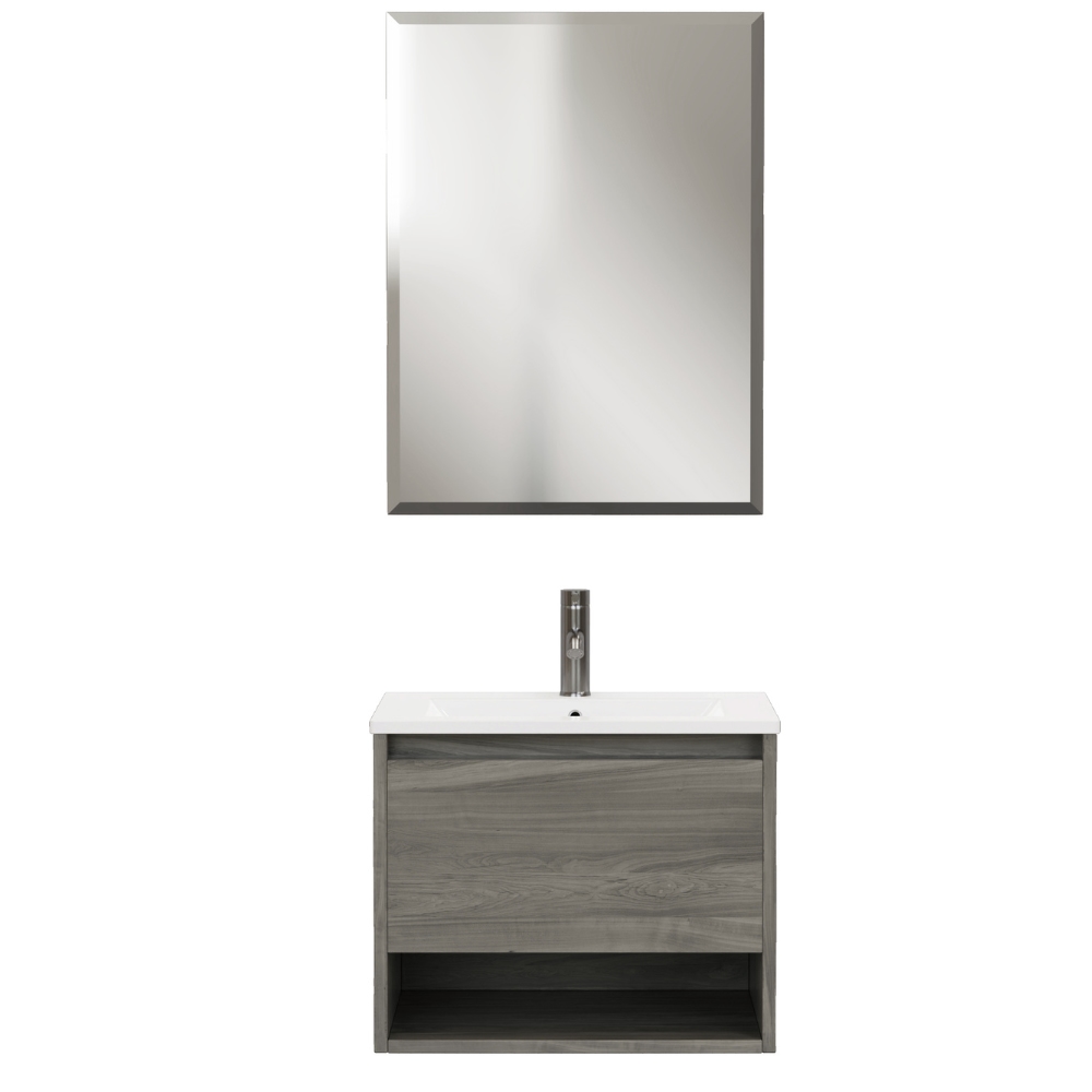 ZIK Badezimmerschrank mit Spiegel und Waschbecken, 1 Schublade, 1 offenes Fach, 60 x 46 x 48 cm, Hängeschrank, modernes Design – Eiche grau