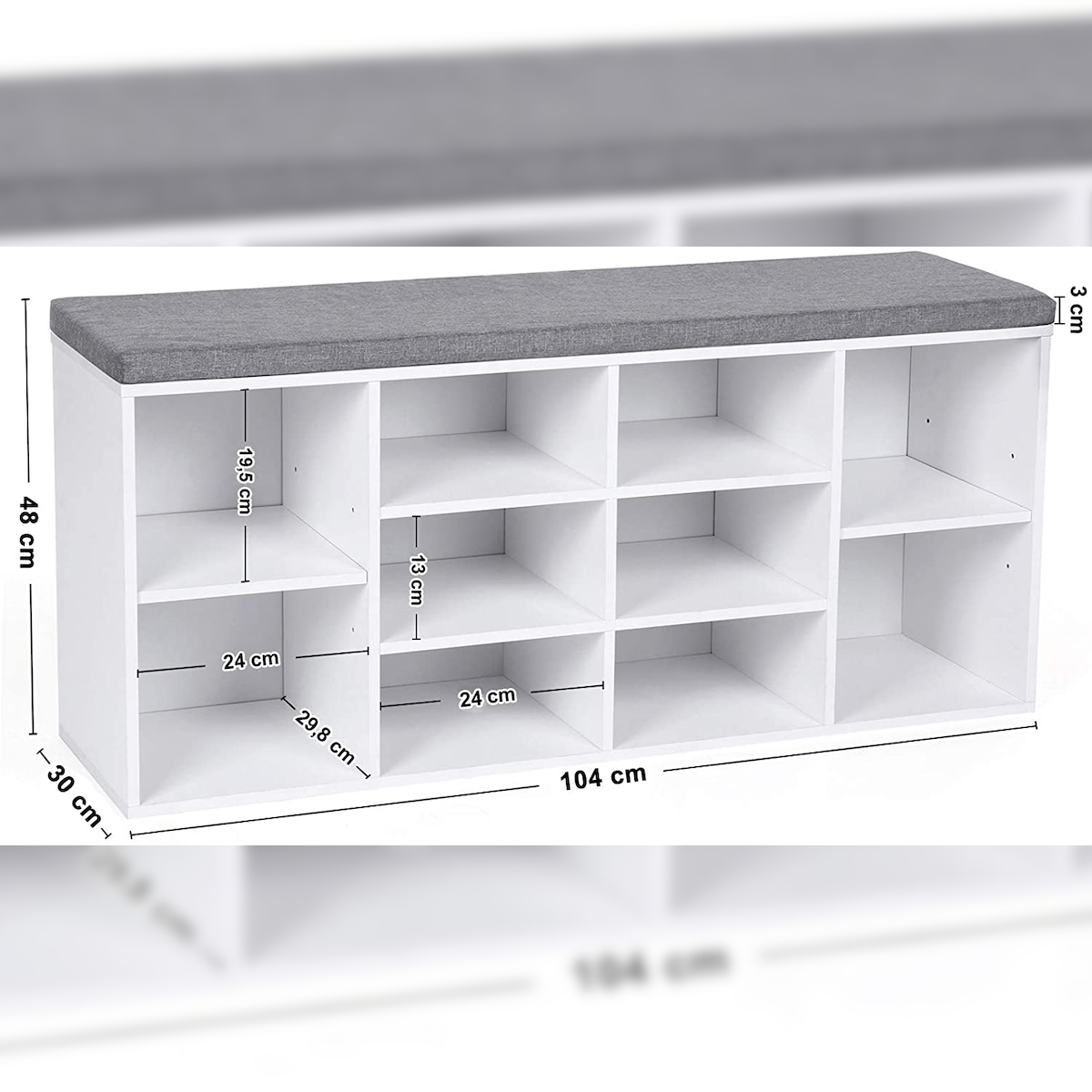 UAC Schuhbank Sitzbank mit Sitzkissen 104 x 30 x 48 cm, 10 Fächer, bis 150 kg belastbar, mit Polsterung, abnehmbare Bezug, Schuhregal, weiß