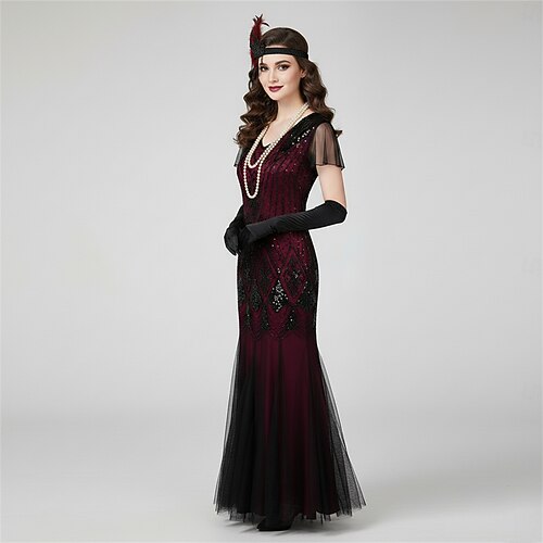 Set Retrò Vintage Anni Ruggenti Anni 1920 Lunghezza al pavimento Vestito Abiti Abito da cocktail con accessori Maniche corte Il grande Gatsby Invitato al matrimonio Paillettes Scollo a V Costume Per