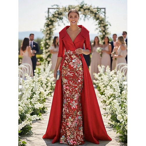 Linea ad A Tubino Colonna Lunghezza al pavimento Perline ricamate Abito da invitata a nozze Abito Formale Abito da cerimonia per signora Manica 3/4 Scollo a V Colletto a Camicia Elegante Vintage