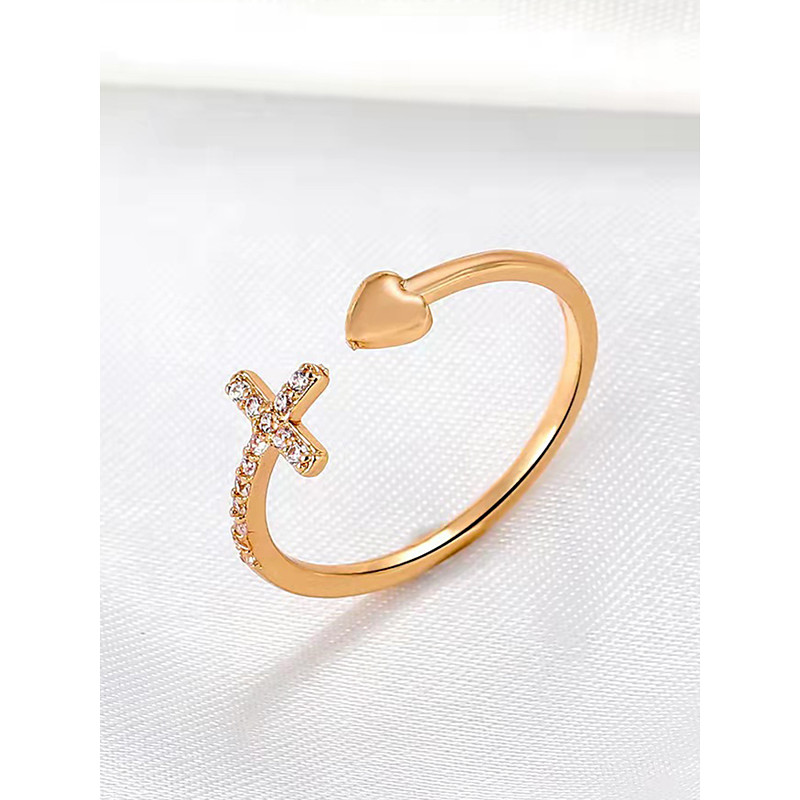Women's Heart and Cross Ring – Adjustable Silver Plated Open Band with Cubic Zirconia, Minimalist Jewelry for Ladies Christmas Gift