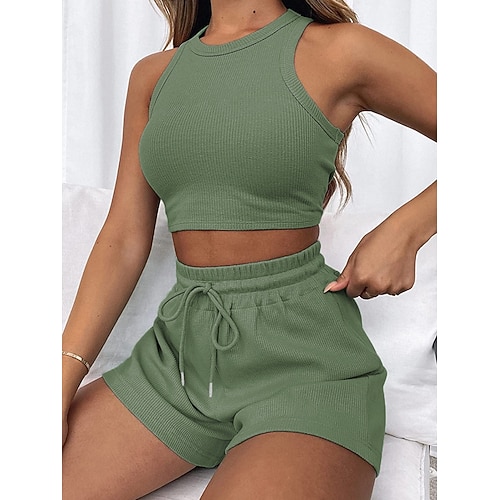 Per donna Set di Pantaloncini Senza Maniche Girocollo Tinta unica Coulisse Moda Streetwear Casuale Quotidiano All'aperto Nero Bianco Verde militare Estate Vestibilità regolare