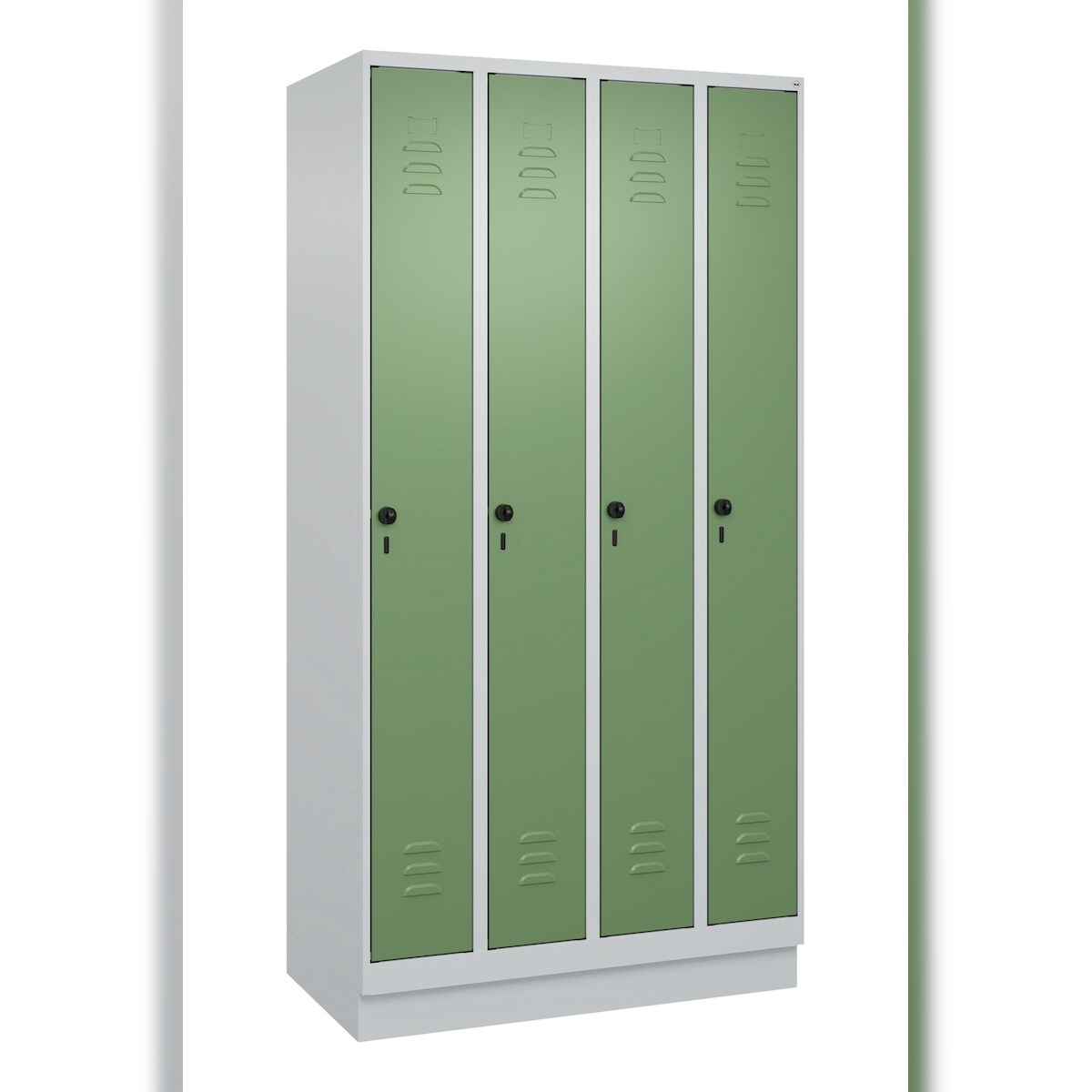 C+P Spind Classic PLUS, Sockel, 4 Abteile, HxBxT 195x100x50cm, Sicherheitsdrehriegel, Hellgrau/Resedagrün von PROREGAL