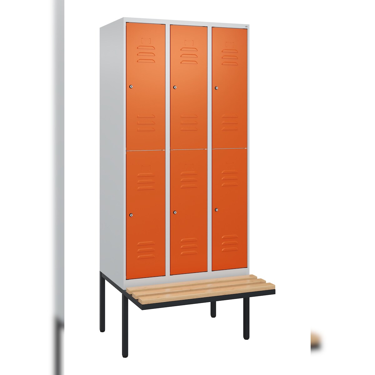 C+P Spind Classic PLUS, Buche schwebende Sitzbank, 6 Abteile, HxBxT 212x90x82cm, Zylinderschloss, Hellgrau/Reinorange von PROREGAL