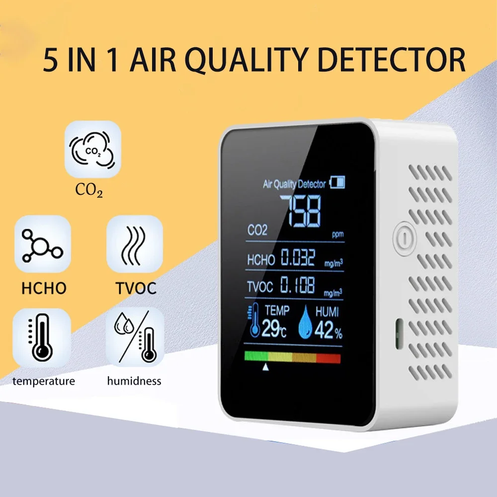 Multifunctional 5in1 CO2 Meter Digital Temperature Humidity Tester Carbon Dioxide TVOC HCHO Detector Air Quality Monitor