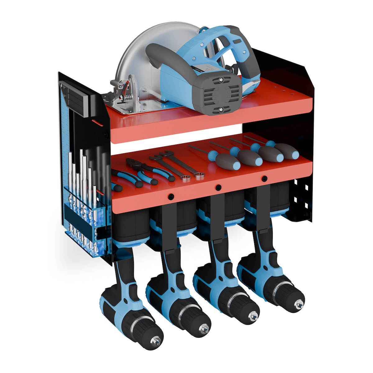 Relaxdays Werkzeugspeicher Wandhalterung, 4 Akkuschrauber, HBT: 30,5x44x23 cm, Werkstatt Organizer, Stahl, rot/schwarz