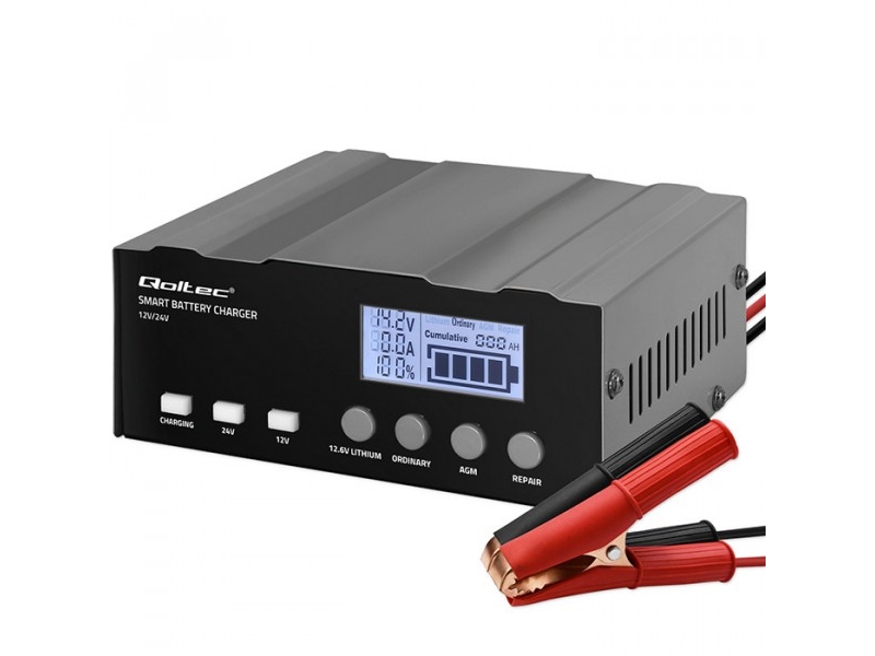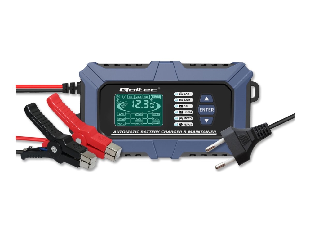 Qoltec intelligent mikroprocessorbaseret oplader 12V 10A | Ensretter med reparationsfunktion til AGM GEL LiFePO4 batteri | LCD