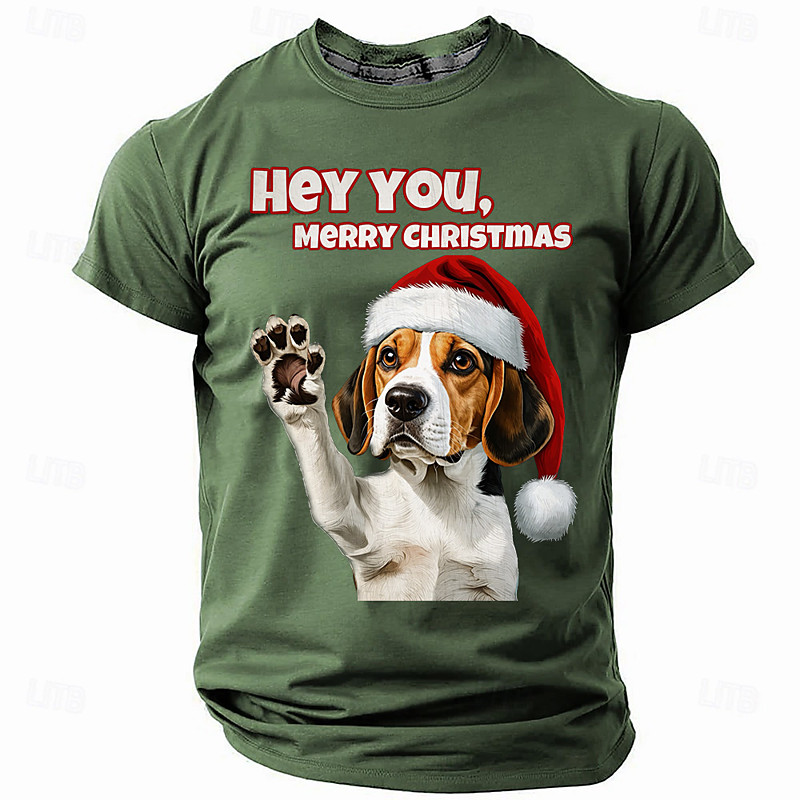 Men's Christmas Graphic T-Shirt, Short Sleeve with Beagle Dog in Santa Hat 'Hey You, Merry Christmas'