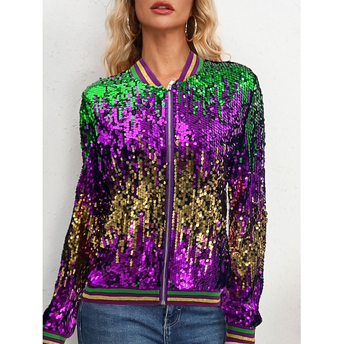 Giacca bomber da donna Carnival Giacca Casual Comoda Traspirante Cerniera Paillettes Casual Blocco di Colore Vacanza Festa Cerniera Collo alzato Vestibilità Regolare a maniche lunghe esterno viola