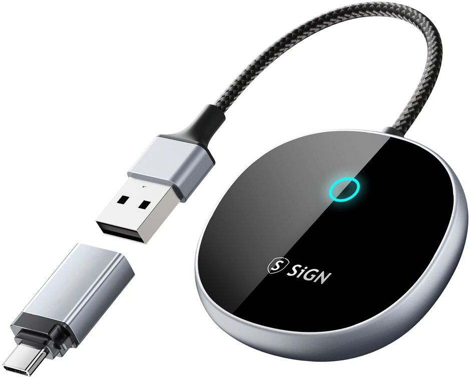 SiGN Wireless CarPlay Adapter - trådlös CarPlay för iPhone, automatisk anslutning via Bluetooth, stöd för rattkontroller, navigation och musik