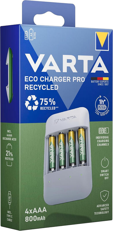 VARTA Batterieladegerät, inkl. 4x AAA 800mAh, Ladegerät für wiederaufladbare AA/AAA-Batterien, Eco Charger Pro, Einzelplatzladung, Gehäuse aus 75% recyceltem Material