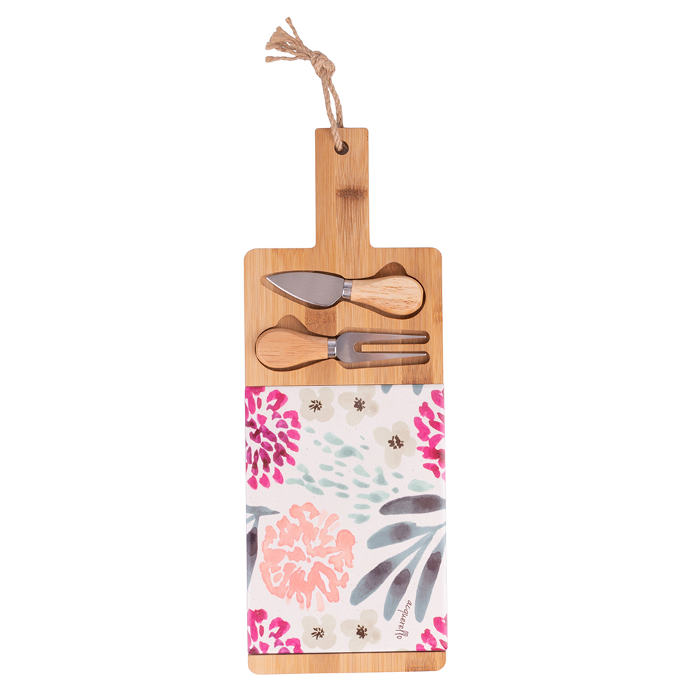 <p>Set tagliere e 2 coltelli da formaggio, in legno di bambù, decoro floreale in ceramica, 15x41 cm, Ne</p>