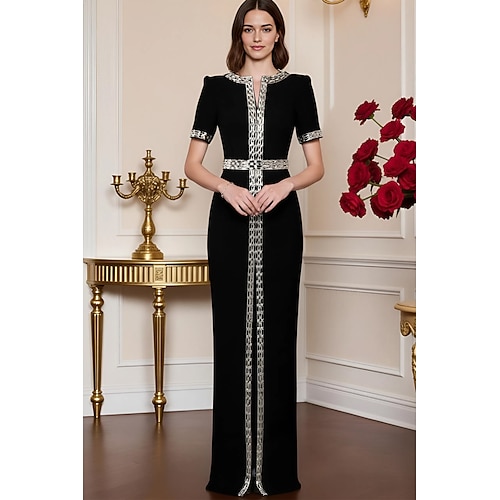 Abito formale A-Line lunghezza pavimento abito tubo colonna abito da sera abito da sera elegante vintage abito nero manica corta collo tondo nozze formale con cristalli perline