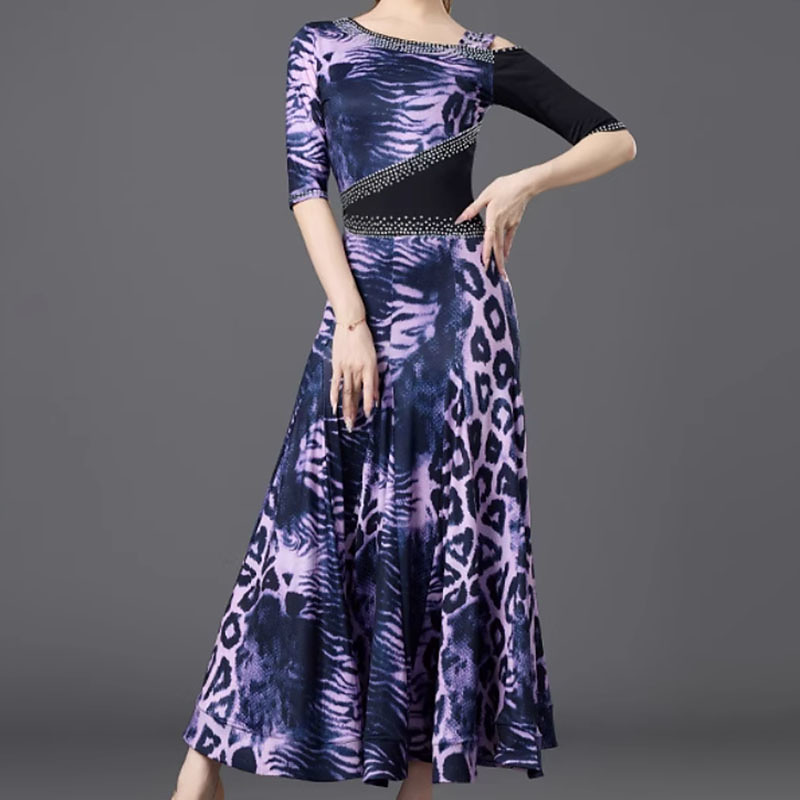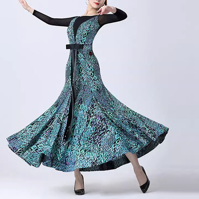 Ballroom Dance Dress Printing Splicing Women's Performance Party Long Sleeve Crystal Cotton Mesh