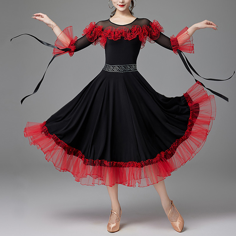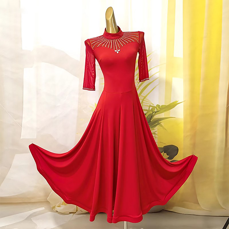 Ballroom Dance Dress Pure Color Splicing Women's Performance Party Long Sleeve Crystal Cotton Mesh