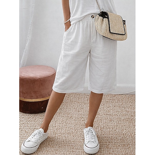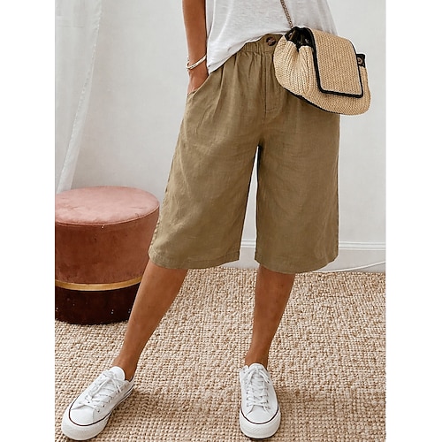 Frauen Leinenähnliche Fake Baumwolle Leinen Chinos Shorts Urlaub Basic Knie-Länge Mittlere Taille Komfort Unelastisch Lässig Alltag Zuhause Weiß Khaki Sommer Frühling Regelmäßiger Schnitt