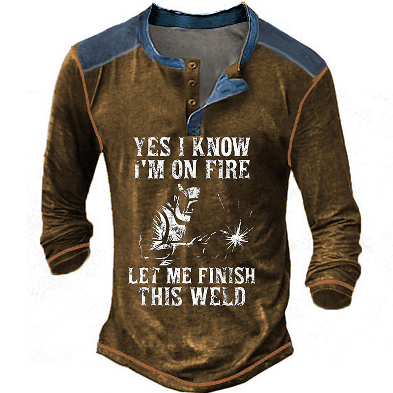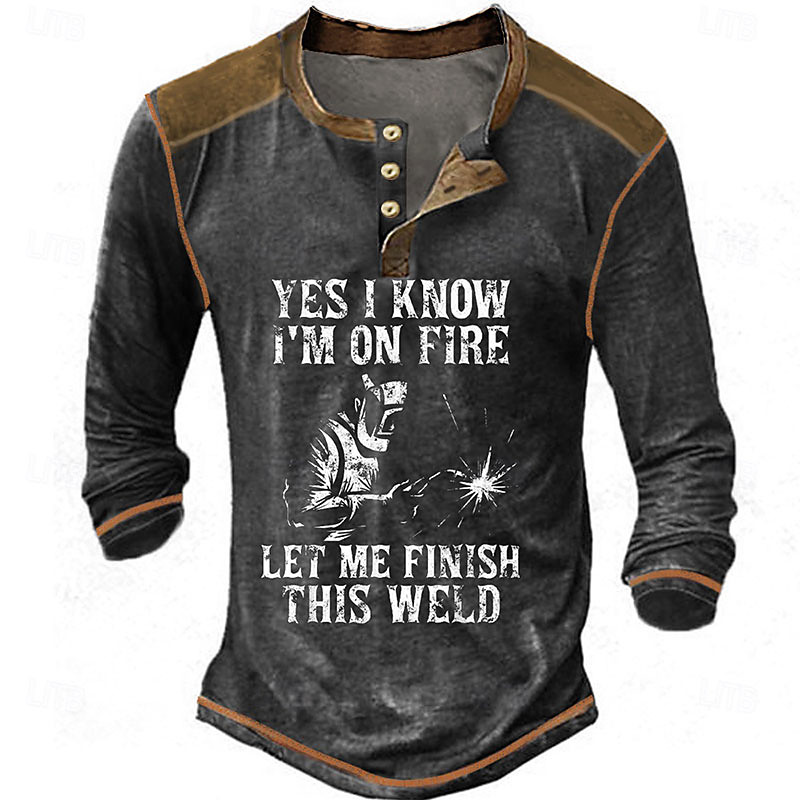 Long Sleeve Men's Welder Graphic Henley Shirt 'I'm On Fire Let Me Finish This Weld' Work Humor Tee