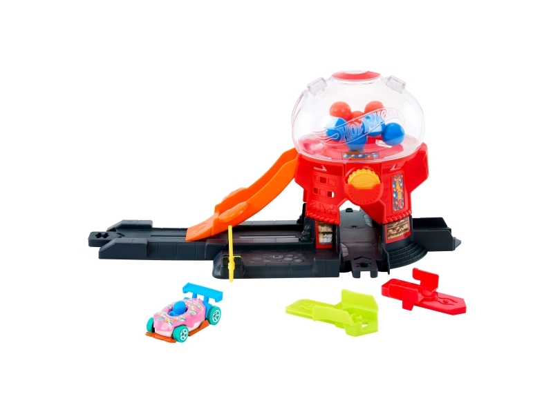 Hot Wheels City Downtown Candy Shop Playset & 1:64 Scale Die-Cast Toy Car, Speed Snap Track