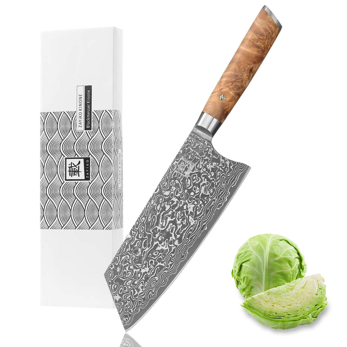 Zayiko Kinone Damast Chefmesser Kiritsuke I 20 cm Klinge I Wurzelholzgriff Birke