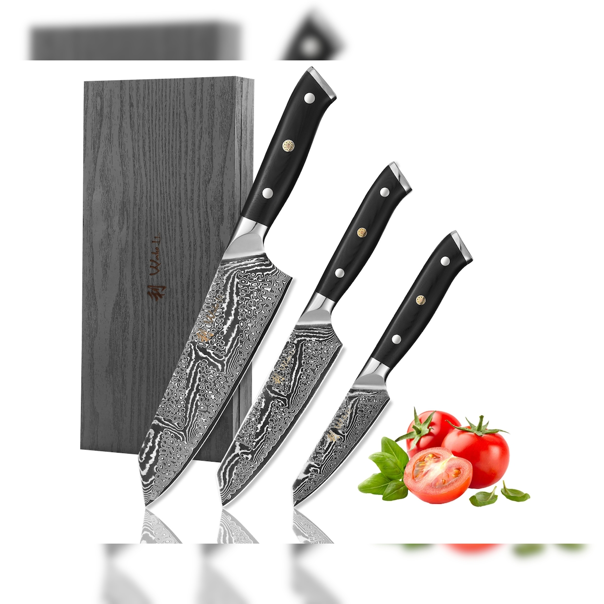 Wakoli Nitoko 3er Kiritsuke Damastmesser-Set - Profi Damast-Küchenmesser Set aus echtem 67 Lagen Damaststahl mit G10 Griff, durchgehender Erl - Inklus