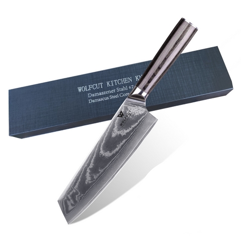 WOLFCUT - Damaskus Kiritsuke Messer mit schwarzem Pakkaholzgriff 20 cm Klinge 67-lagiger Damaszenerstahl mit Geschenkbox