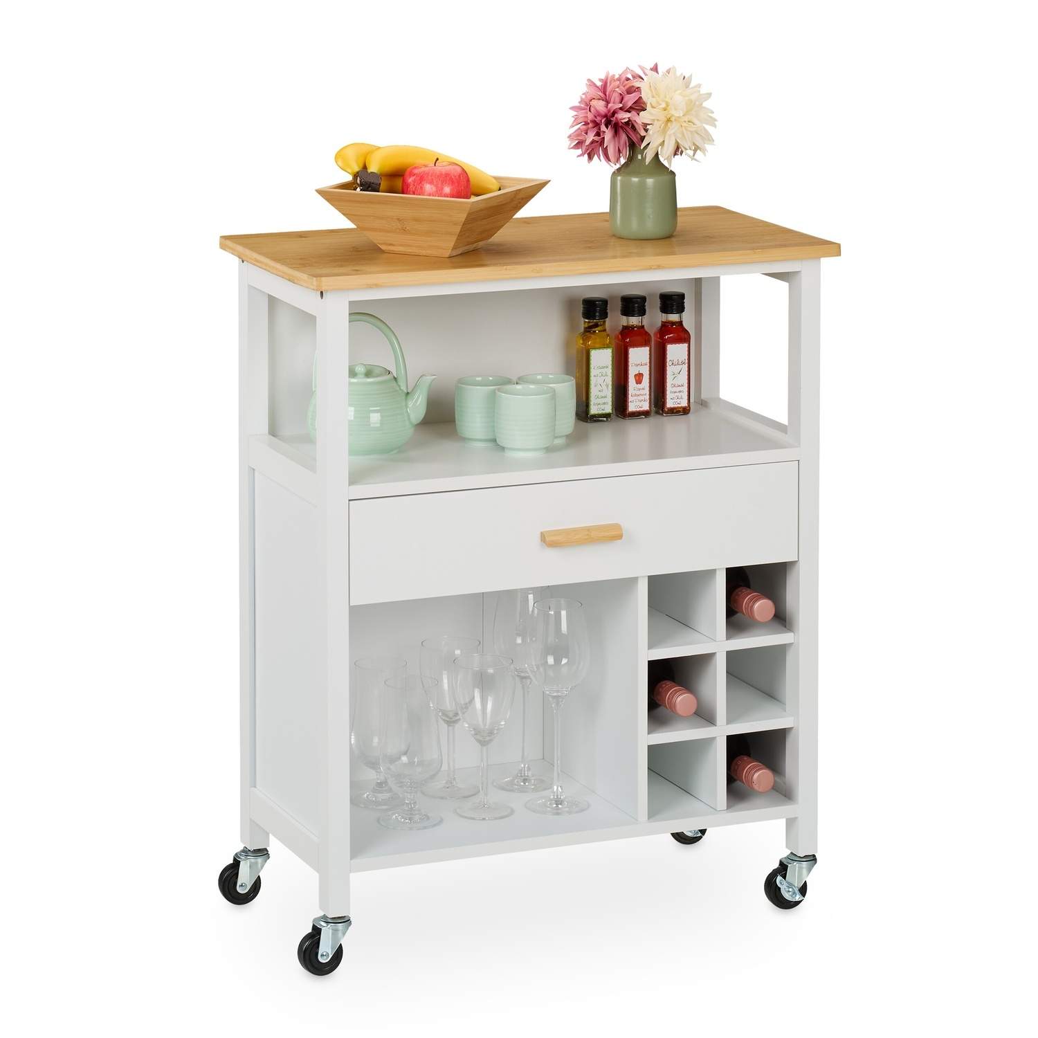 Kitchen Island Cart bambutopilla ja viinitelineellä