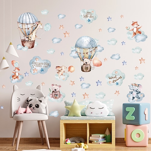 Adesivo da parete con animali dei cartoni animati, grandi sogni, luna blu acquerello e mongolfiera, decalcomania da parete rimovibile per cameretta dei bambini, arredamento per la casa, sfondo
