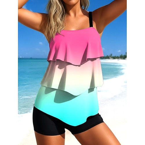 Costume da bagno a due pezzi Tankini da donna Colorblock Vita Alta Ruffle Layered Schiena Nuda Vacanza Mare Abbigliamento Ombre Grafico Collo a U Senza Maniche