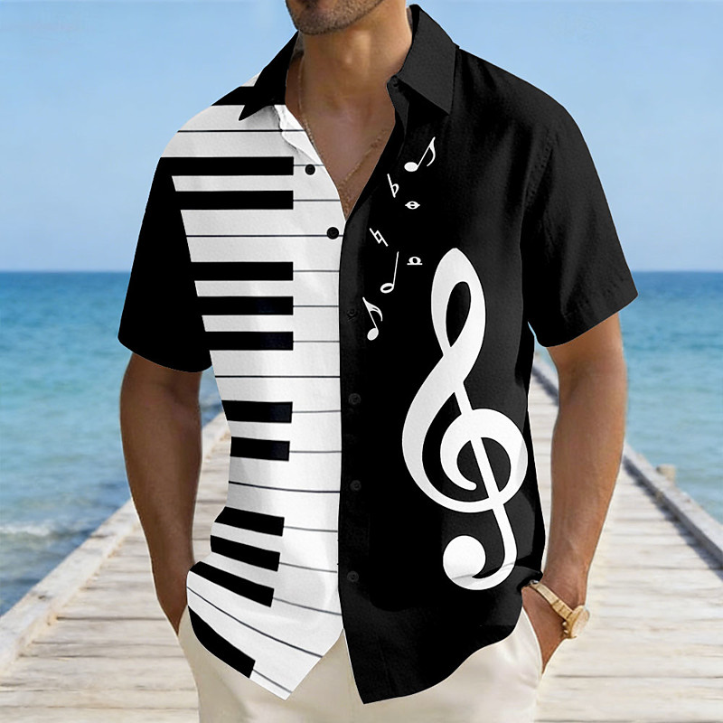 Men's Piano Musical Notes Shirt Summer Shirt Button Up Shirt Short Sleeve Vintage Retro Outdoor Vacation Music Festival Summer Turndown 3D Print Linen Like Shirt Blue Black Purple Green