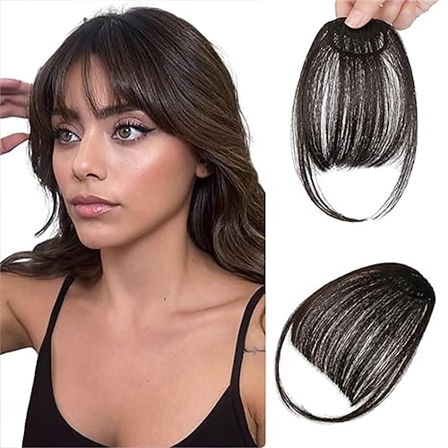 Clip-in-Pony, natürlicher Fake-Pony, Haarspange, schwarzbrauner französischer Pony mit Schläfenpartie, Haarteile zum Anclipsen, Haarverlängerungen, geschwungener Pony für den Alltag