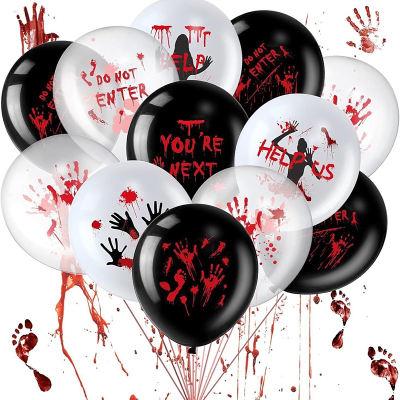 18pcs Scary Halloween Balloons 12 Inch - Blood Splatter Horror Phrases Latex Balloons with Eye Design Zombie Handprints Black White Decor for Vampire Birthday Party Supplies Spooky Balloon Des