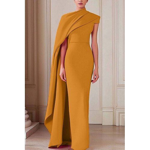 Abito Cape Giallo Sirena Tromba Abito da Sera con Cape Staccabile Elegante Abito Formale Semi Formale Matrimonio Lunghezza Piena Senza Maniche Scollo Alto Crepe Elasticizzato