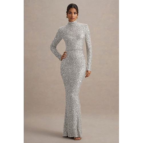 Sirena Tromba Lunghezza al pavimento Abito da Sera Elegante Scintillante Stile Celebrità Manica Lunga Collo Alto Festa in giardino Matrimonio Con Paillettes con Glitter